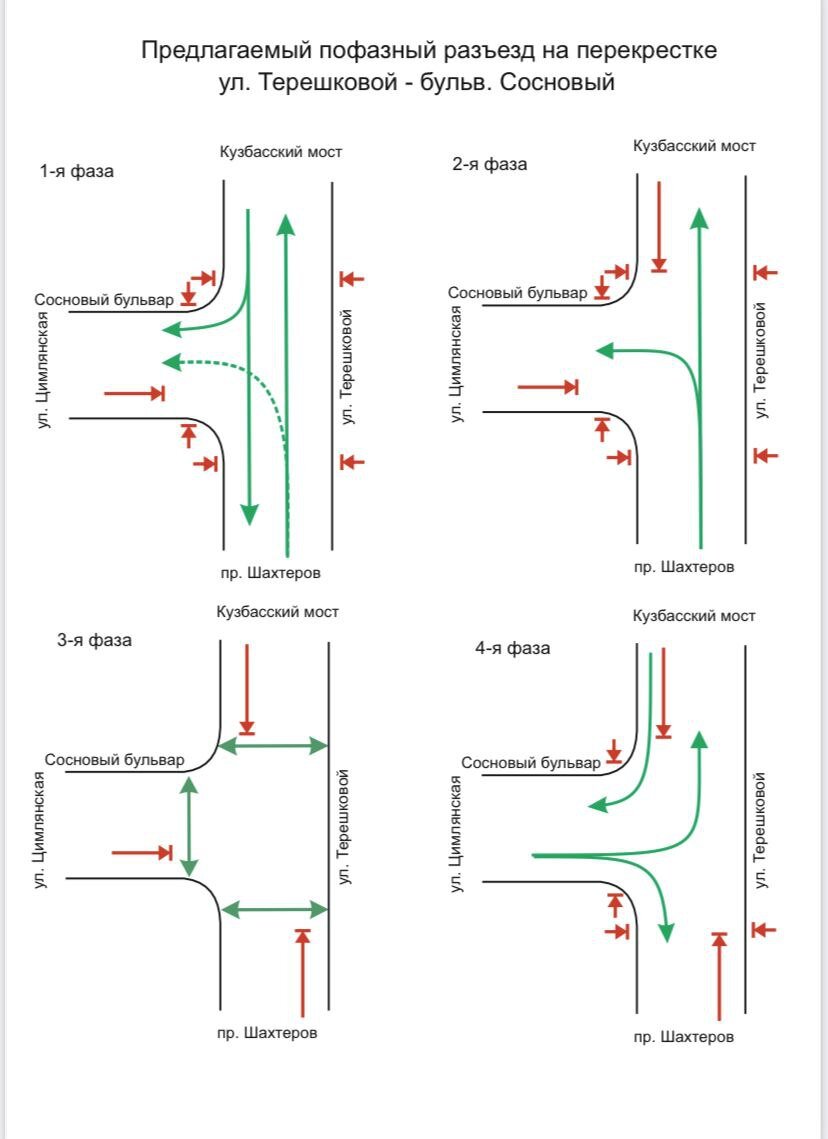 В Кемерове на перекрёстке улицы Терешковой и Соснового бульвара изменился режим работы светофоров. Изменения в схеме проезда перекрёстка произошли с 10 мая, сообщили в администрации города. На перекрёстке появилась отдельная фаза работы светофоров для пешеходов. Также появилась дополнительная фаза для проезда автомобилей направо. Движение транспорта и пешеходов будет осуществляться по фазам: Движение на перекрёстке станет безопаснее. Также увеличится пропускная способность улицы Терешковой при движении со стороны Кузбасского моста. Фото: A42.RU