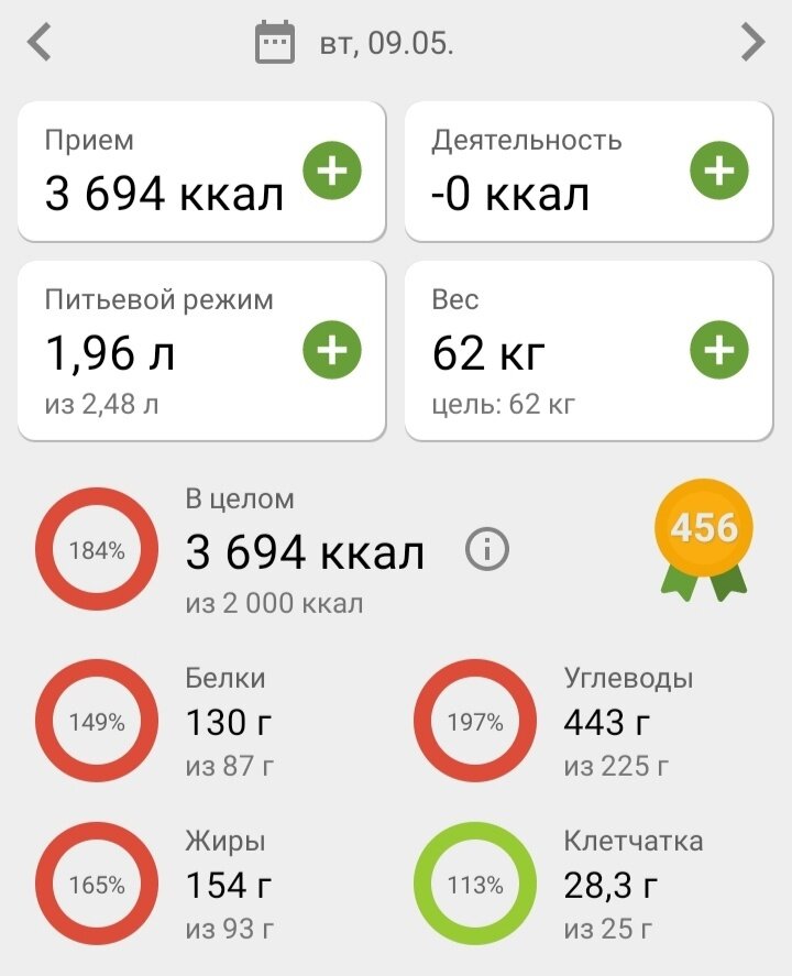 Но я вчера намерено себе увеличила калораж) Просто потому, что с сегодняшнего дня перехожу на ещё более повышенный. Теперь я буду в течение недели питаться на 2000 калорий. А через неделю посмотрим, что будет с весом, и я уже дальше буду думать, как поступать.
