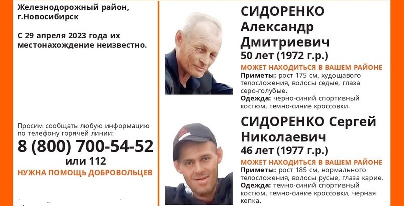 В Новосибирске ищут двух мужчин, пропавших в Железнодорожном районе города, — 50-летний Александр Сидоренко и 46-летний Сергей Сидоренко не выходят на связь с родственниками с 29 апреля 2023 года. Как сообщили в поисковом отряде «ЛизаАлерт», ранее мужчины не пропадали. «Запущен информационный поиск, в Сети идет активное распространение ориентировки», — рассказала НДН.инфо руководитель пресс-службы ПСО «ЛизаАлерт» Новосибирской области Ольга Бобкова. Согласно информации в ориентировках, Сидоренко Александр Дмитриевич 1972 года рождения — худощавого телосложения, рост 175 см, волосы седые, глаза серо-голубые. Был одет в чёрно-синий спортивный костюм и тёмно-синие кроссовки. Сидоренко Сергей Николаевич — нормального телосложения, рост 185 см, волосы русые, глаза карие. Был одет в тёмно-синий спортивный костюм, тёмно-синие кроссовки и чёрную кепку. Если вам что-либо известно о местонахождении пропавших, сообщите по телефону горячей линии отряда 8-800-700-54-52 (круглосуточно, бесплатно) ил