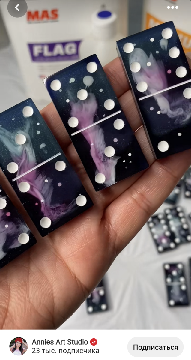Приветствую всех в своем ...эх...ну, вы поняли)) Пока не могу сама ничего делать, вот вам снова чужой мастер класс- надеюсь, Дзен простит мне такое) Аккаунт в Pinterest , откуда я это взяла указан на всех фото Сам эффект выглядит вот так: Разумеется вы можете выбрать другие цвета, добавить чего то своего - как всегда, я даю лишь алгоритм) Что вам понадобится : 1. Ювелирная смола 2. Белый краситель непрозрачный и один темный ( фиолетовый, синий и тд- это подложка для самого космоса) 3. Прозрачные красители голубой, розовый, фиолетовый 4. По желанию - блестки, поталь для окрашивания готового изделия. Как делать: 1. Берём молд ( тут домино, поэтом лучше начать с чего то небольшого. Как будет выглядеть на большом я не знаю). Заливаем примерно миллиметр просто прозрачной смолы и ждем часов 12 до полимеризации. 2. На этот тонкий слой смолы наносим зубочисткой капельки белого пигмента- точки звёзды. Так же на этом этапе можно добавить блестки звезды. Если совсем хотите натуральности- можно