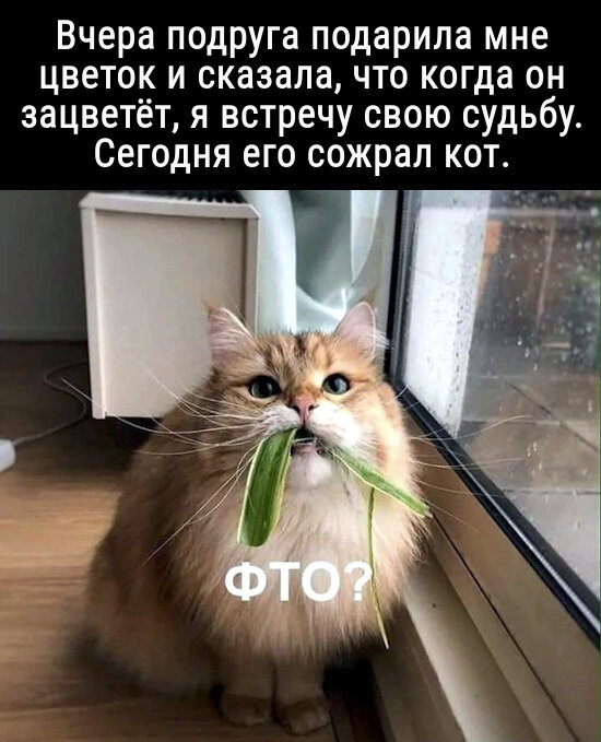 Наши пушистики делают жизнь ярче и веселее. А вы как считаете? "Не судьба!" — Мой размерчик! А тряпочку можно было и помягче постелить! "Когда Мурзику крышка" "Когда у хозяина выходной, у кота — будни" "Личный котопсихолог к приёму готов!" — Где Наташа? — В магазин ушла. — Чего так долго её нет? Заблудилась, наверное! — Давайте вместе: Наташааа! Наташааа! "Кот на новоселье: — Высоко-то как забрались! Нашего домика отсюда не видать! Как теперь гулять-то ходить?" "Когда Матроскин не в духе: — Тук-тук! — Иди отсюда, Печкин! Дома нет никто!" "Эх, огородники! Лучше бы котлеты выращивали, что ли!" Хорошего дня! С вами был Саймон 🐾 Читайте ещё 👇