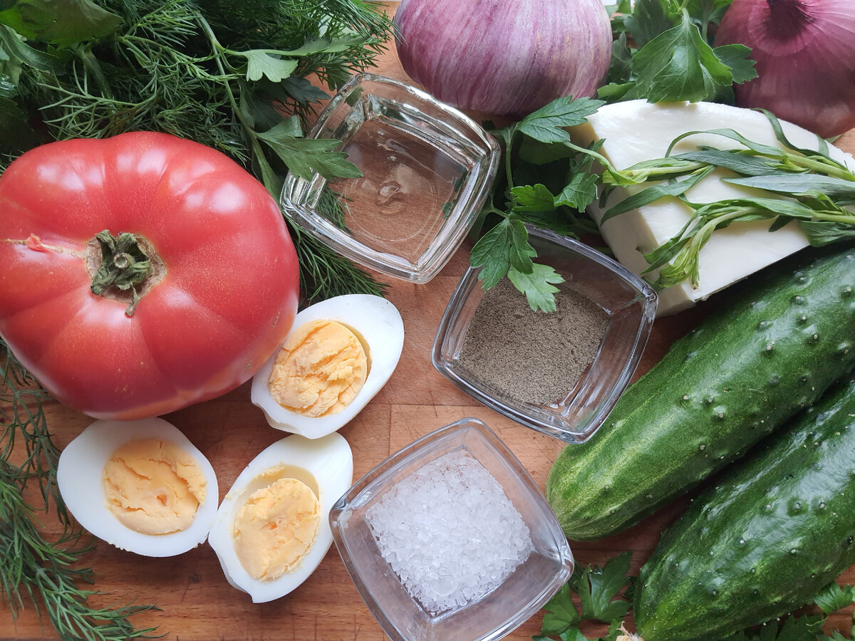 Итак, что же за чудо-блюдо. Ничего необычного или экзотического. Наоборот, простые и всем известные продукты: помидоры, огурцы, репчатый лук, чеснок, сыр сулугуни, зелень, яйца по желанию.