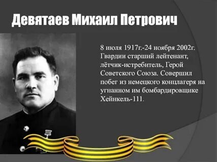 Если бы знали тогда фашисты, на какой отчаянный шаг решится Михаил Девятаев, не прожил бы он и дня в плену . 8 февраля 1945 года он под носом у охранников-эсэсовцев поднял в небо с аэродрома Пенемюнде немецкий «Хейнкель» с десятью узниками на борту! Фашисты организовали преследование беглецов, но Девятаева с товарищами им не удалось догнать.