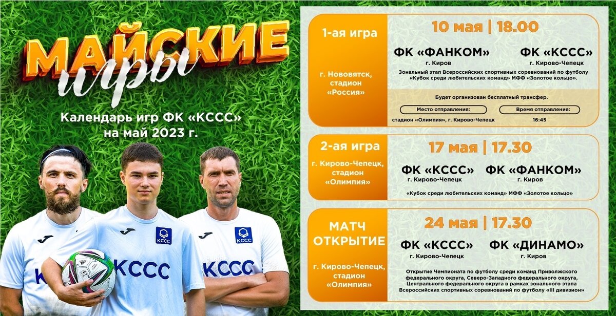 Сегодня, 10 мая стартует первая игра в рамках Зонального этапа Всероссийских спортивных соревнований по футболу «Кубок среди любительских команд» МФФ «Золотое кольцо». Матч состоится в городе Нововятске против команды «Фанком» в 18:00. Отметим, что на игру организован трансфер от стадиона «Олимпия» г. Кирово-Чепецка. Автобус: Белый Higer, гос. номер 088. Время отправления: 16:45. Предлагаем ознакомиться с расписанием игр в мае, и ждём всех болельщиков футбола на матчи нашей команды «КССС»! Футбольный клуб «КССС»