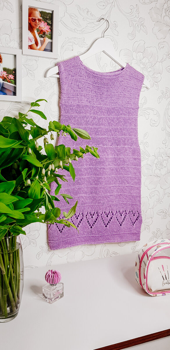 Параметры готового платья после стирки ОГ – 74 см ОТ – 74 см ОБ – 90 см Длина 72 см Внимание: после машинной стирки немного подсело. Вам потребуется: 1. Пряжа 50 гр – 175 м 8 мотков – вяжем в 2 нитки (у меня состав мерсеризированный хлопок 100 %) 2. Спицы № 3,5; 3. Крючок № 3,5. Плотность вязания 10x10см = 20 п x26 рядов. Вяжется по кругу. Набираем 169 п. + 1 соединительная, замыкаем в круг и 1 ряд вяжем изнаночными петлями; 2-9 ряд – лицевыми; 10 ряд – изнаночными; 11-18 ряд – лицевыми; 19-33 ряд – узор «Сердечки» (смотрите схему) 34-40 ряд – лицевыми; 41 ряд – изнаночными. Далее продолжаем все вязание: 9 рядов – лицевыми, 10 ряд – изнаночный. На высоте 42 см равномерно убавить 25 петель, для этого провязываем каждую 6 и 7 петлю по 2 п вместе лицевыми = 144 п. Вяжем прямо 18 см, далее вяжем отдельно перед и спинку по 72 п. прямо 18 см. Когда вяжем изнаночные ряды, то вяжем петли за заднюю стенку, чтобы петельки были как при круговом вязании, не перекрещенные. Убавки для горлов