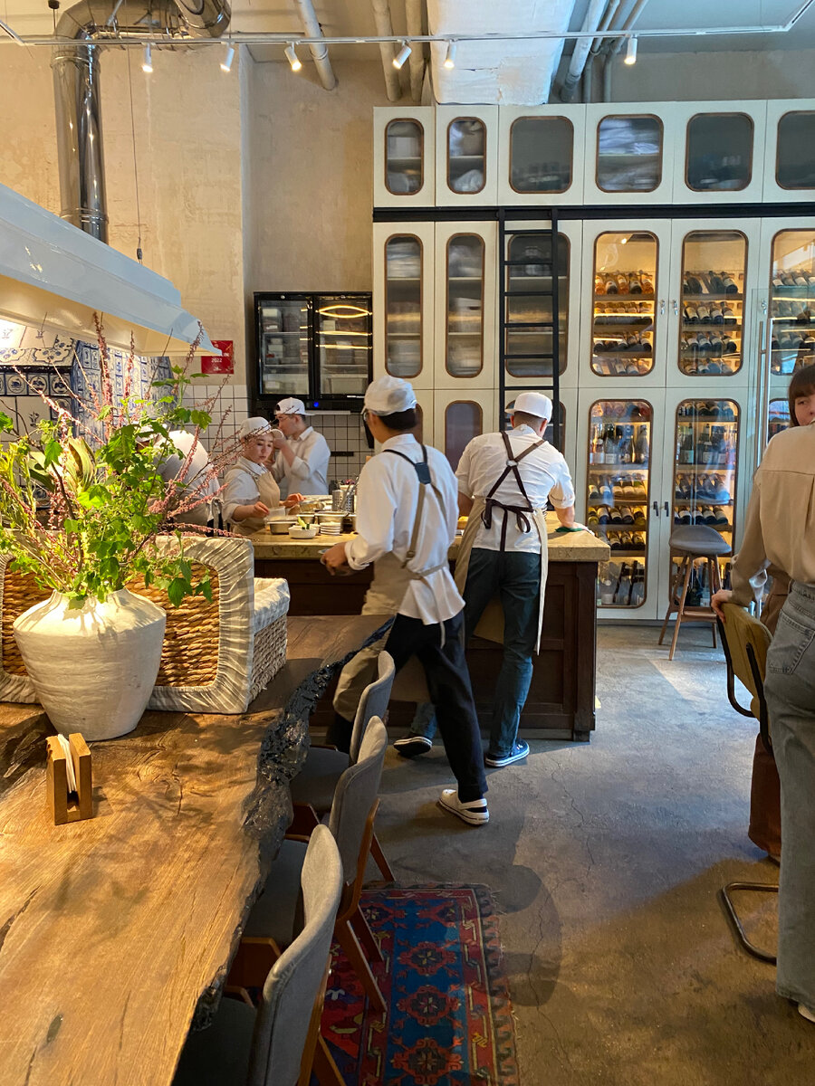 Интерьер: где то немного стиля лофт, где то современность. Все смотрится гармонично и лаконично. Бумажные белые листы на столах…Вы помните мое отношение к ним - не нравится) Ещё это довольно маленькое помещение, но удачные места - за баром, и столики у стены. Нам хотели посадить в проходе - это очень неудобно, так как за твоей спиной туда-сюда постоянно кто то ходит и мы пересели за общий стол. Еда: В качестве комплимента подают хумус с свежими овощами. Это вкусно, и я обрадовалась, что это был не хлеб:))) Перцы на гриле, фета, кедровые орешки - 650 рублей. Мне понравилось, хорошее сочетание соуса с перцами, а фета и орешки отлично дополняют друг друга Халуми, мед, трюфельное масло - 590 рублей. Очень вкусно, обожаю когда сладкое соприкасается с соленым 🤤 Орзо с морепродуктами - 1150 рублей. Обжаренные на гриле креветки, кальмары томатная сальса и зелень. Просто 10/10. Мне было очень вкусно, блюдо имеет насыщенный вкус морепродуктов Мусс из вареной сгущенки, малина, жареный бел