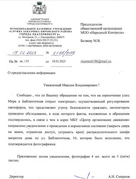 Публикуем ранее поступивший ответ по обращению жителей Екатеринбурга об открытом электрощитке (https://nkregion.ru/news/otkrytyj-naraspashku-jelektroshhitok/). Сообщаю , что по Вашему обращению «о том, что на пересечении улиц Мира и Библиотечная открыт электрощит, осуществляющий регулирование светофоров, что представляет угрозу безопасности граждан», инспектором проведено обследование, в ходе которого факты, изложенные в обращении подтвердились, в связи с чем в адрес МБУ «Центр организации движения» направлено уведомление о приведении в нормативное состояние (закрыть дверь на замок, ограничив доступ, устранить крен) распределительного шкафа напротив дома по ул. Библиотечная, 54, которое было исполнено, что подтверждается фотографиями. Благодарим МКУ Служба заказчика Кировского района города Екатеринбурга за исчерпывающий ответ и реагирование. Если Вам стало известно о совершаемых правонарушениях — сообщайте Нам о данных фактах через наше мобильное приложение. Желательно указывать макси