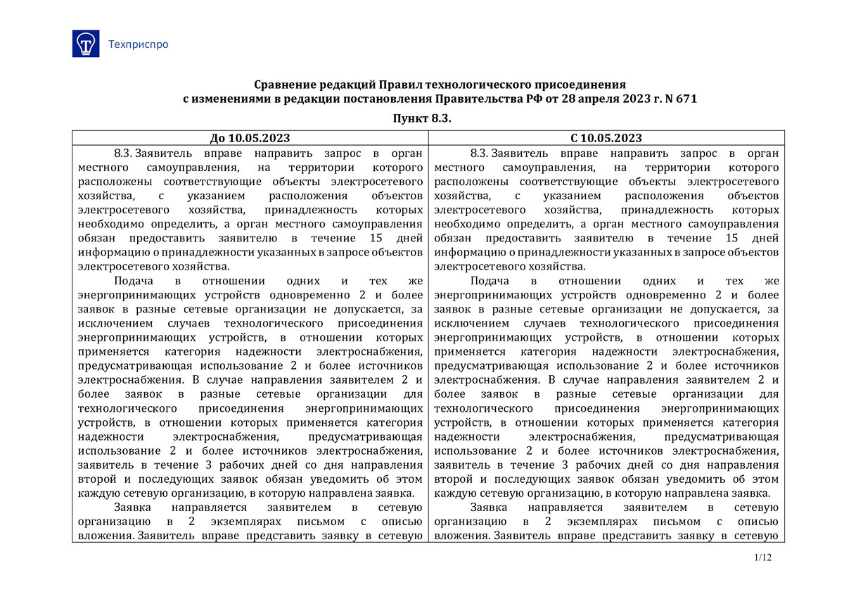 С 10 мая 2023 вступила в силу новая редакция Правил технологического присоединения. Так постановлением Правительства РФ от 28 апреля 2023 г. N 671 внесены изменения в пункт 8.3 Правил в части возможности ТСО организовать прием заявки на техприсоединение через портал Госуслуг. Речь идет о праве ТСО организовать такую процедуру, а не об обязанности. Предлагаем изучить сравнение редакций Правил ТП. С полной версией можно ознакомиться в одноименном телеграмм канале Техприспро, tehprispro. Поделитесь этим постом с коллегами, чтобы и они были в курсе последних событий в технологическом присоединении к электрическим сетям! Подписывайтесь на канал и оставайтесь в курсе новостей электроэнергетики!
