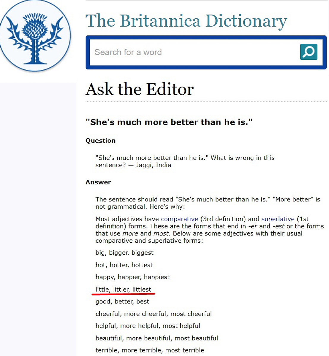 В одной очень авторитетной группе для преподавателей выложили скрин из https://www.britannica.com/dictionary: Ошибки быть не может!! Сразу я, также как и многие мои коллеги, не нашлась с ответом, как объяснить наличие таких форм у 'little'. Также, я не могла вспомнить ни одного учебника, где бы этот нюанс объяснялся.