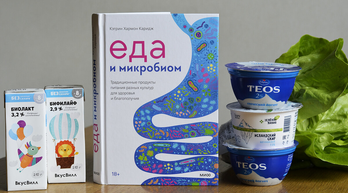 Именно такая задача сейчас стоит передо мной очень остро. Моя дочка не очень любит овощи, избирательна во фруктах, не есть супы, а йогурты и творог любит исключительно со сладкими наполнителями. У нас была большая детская иллюстрированная книга про еду, и я очень надеялась, что дочка проявит любопытство и согласится попробовать шпинат или разные сорта салата. Чуда не случилось. В книге ее заинтересовал раздел выпечка и торты. Кто бы сомневался! Я продолжила изучать информацию о полезной пище и ее влияние на наш организм. Выбрала новинку издательства МИФ из серии «Самый здоровый человек» — «Еда и микробиом. Традиционные продукты питания разных культур для здоровья и благополучия» Кэтрин Хармон Каридж. Отступление: продукты на фотографии не реклама! Просто это то, что сейчас реально есть в моем холодильнике. Сразу скажу, чего-то неожиданного, принципиально нового я не узнала! Я дала книгу прочитать мужу, через три дня он передал ее со словами: «все как обычно – зелень, овощи, кисломолочк