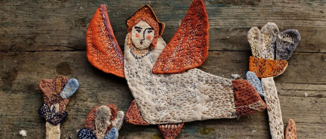 — Для диплома нужно было сделать какую-то творческую работу. Можно было выбрать технику, в которой будешь работать: керамику и скульптуру, гобелен, ткачество, роспись, батик. Я взяла работу с тканями, хотя ещё не знала до конца, что это будет. Выбрала текст писателя Бориса Шергина «Двинская земля» и начала делать эскизы, зарисовки, что-то складывать из лоскутов, пришивать. Появилась «наивная вышивка» — надписи, цитаты, фразы. Надписи так и остались в моих работах (до сих пор их «подписываю»).