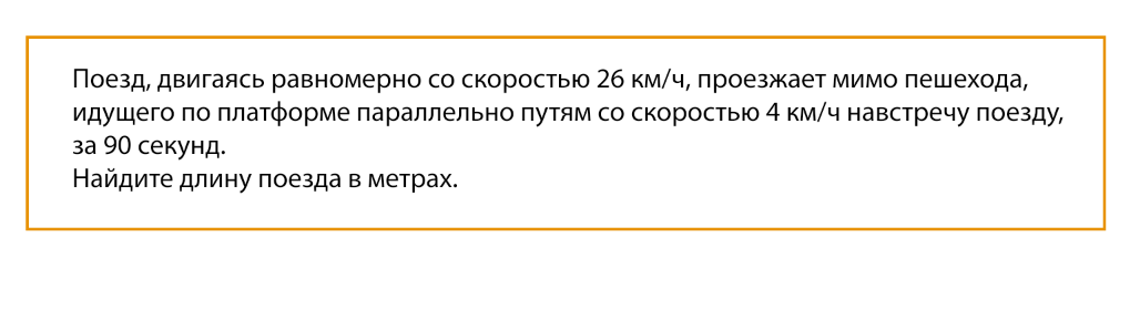 Поезд, двигаясь равномерно со скоростью 26 км/ч, проезжает мимо пешехода, идущего по платформе параллельно путям со скоростью 4 км/ч навстречу поезду, за 90 секунд. Найдите длину поезда в метрах.