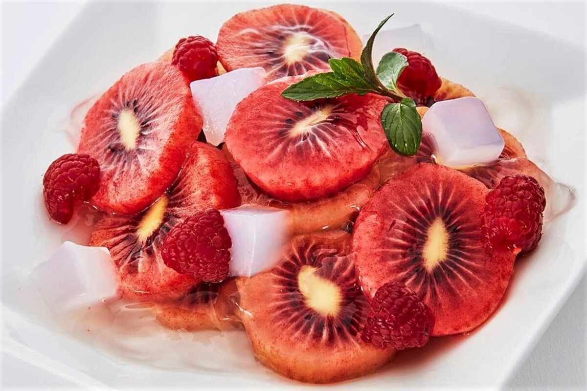 Вчера я рассказывала о достаточно редких красных киви, сезон которых начался в Японии, их продают у нас в Фукуоке. С этими фруктами японки начали готовить разные интересные блюда, например, фруктовые салаты с ягодами и "nata de coco" (о "nata de coco" - ссылка в конце статьи).