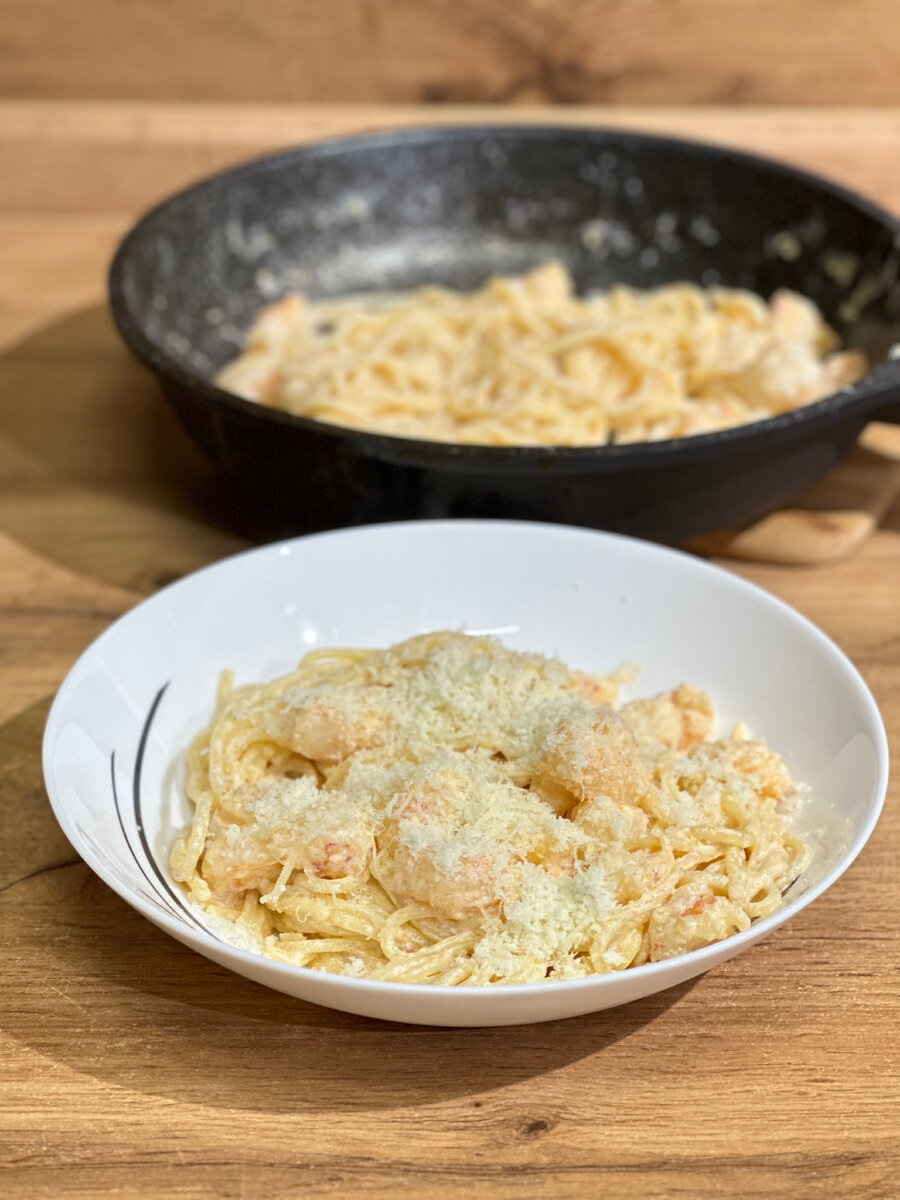 В качестве белка предлагаю взять креветки. Но к данному рецепту также идеально подойдет курица 1. Первым делом ставим вариться макароны - у меня спагетти. Варим согласно времени, указанному на упаковке. 2. А пока варятся макароны, обжариваем креветки пару минут - добавляем к ним растительное масло и соль, и жарим на сухой сковородке. Если берете курицу - можно сделать также, предварительно порезав ее небольшим кубиком. 3. На место креветок/курицы кладем кусочек сливочного масла и пару зубчиков чеснока. Я еще добавляю немного острого перца. Уже через минуту добавляем 10% сливки. Ставим на сильный огонь. 4. Уже через 5-7 минут сливочная масса должна загустеть. Обратно кладем креветки/курицу, присыпаем солью, а также добавляем макароны. Даем схватиться всем вкусам пару минут и снимаем с плиты. 5. При подаче посыпаем тертым пармезаном (по желанию). Ингредиенты: спагетти 200гр, сливки 10% 200мл, соль 1ч.л, чеснок 2 зубчика, чили перец по вкусу, креветки/курица 300гр + немного соли