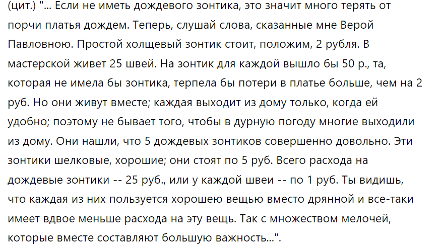 Из всех описаний прелестей социализма, которыми переполнен роман "Что делать?" - самым известным стал "алюминиевый сон" Веры Палны - лично на меня самое большое впечатление произвело рассуждение о зонтах. Я прям взбешен тем, что оно не очень раскручено. Это в описании "швейной коммуны - 2", устроенной Верой Палной (как я понимаю, по заветам Фурье - до Маркса герои Чернышевского, как известно, не дозрели, хотя Ленин и объявил Чернышевского ближе всех в России подошедшим к марксизму). "Швейная коммуна - 1" это у Палны при первом муже, а "швейная коммуна - 2" - при втором. Прекрасный кейс для обсуждения "блеска и нищеты" левой политической идеи. С одной стороны, "блеск" - ослепление и очарование тем, как в принципе легко можно было бы устроить жизнь удобную и счастливую. Ведь легко понять (если объяснят), как жизнь может быть устроена РАЗУМНО. В самом деле, все устроено так идиотски - 25 швей тратятся на 25 зонтиков, а ведь все двадцать пять разом под дождь не пойдут. И как проста и р