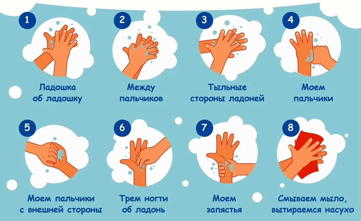 В этом посту хотелось бы обговорить такую казалось бы банальную тему как мытьё рук. Мало кто из нас об этом задумывается, но это очень важно. 😓🤫 Почему? 🤔 1. Только задумайтесь ежедневно соприкасающиейся с различными вещами наши руки переносят около миллиарда различных бактерий! 2. Иногда помимо бактерий к рукам цепляются незримые для глаз яйца глистов (от травы, деревьев, фруктовых деревьев и тд…) 3. Не замечая для себя, в течение дня мы так или иначе задеваем глаза, берём еду руками и соответственно с рук бактерии попадают на еду, а еда в наш организм, что может привести к самым различным инфекциям. Так как же правильно мыть руки ?😵💫 Мы рекомендуем пользоваться схемой мытья рук, которую прикрепили ⬇️ В среднем руки должны мыться от 4-8 раз в сутки, что сюда входит? Обязательно перед приемом пищи и после прогулок. Помните, что крепкое здоровье начинается с профилактики распространения заболевания, то есть его предотвращения, именно поэтому так важно уделять внимание та
