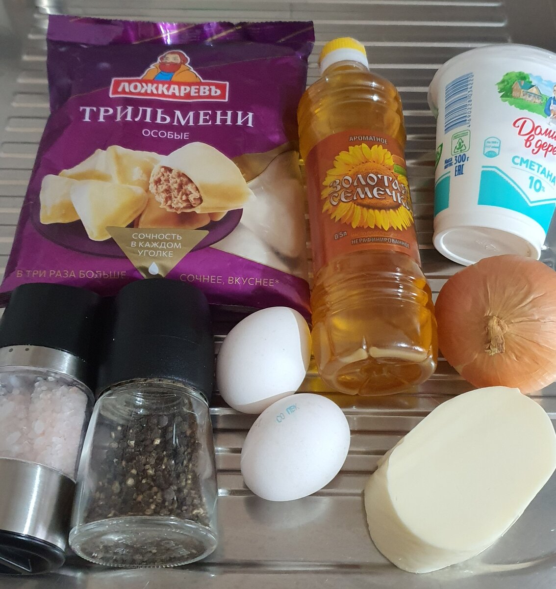 Просто, вкусно, необычно! С приготовлением справится даже ребенок! Отличный вариант для любителей пельменей которым захотелось разнообразия. А ещё это отличный способ "пристроить" пельмени не понравившиеся по вкусу в классическом приготовлении. Ингредиенты: - пельмени замороженные 450 грамм - лук репчатый 1 средняя луковица - сыр твердый 100 грамм - яйцо куриное 2 штуки - сметана 150 грамм - соль, зелень и черный молотый перец по вкусу - растительное масло 2 столовые ложки Лук очистить и нарезать мелким кубиком. Обжарить лук в хорошо разогретом растительном масле до золотистого цвета. Форму смазать растительным маслом. Выложить замороженные пельмени. Посолить и поперчить по вкусу. Сверху выложить жареный лук. В миске соединить сметану и яйца. Перемешать до однородной консистенции. Добавить специи. Тщательно перемешать. Сыр натереть на мелкой терке. Залить пельмени яично-сметанной смесью. Посыпать сыром. Выпекать при температуре 180 градусов около 40 минут до образования