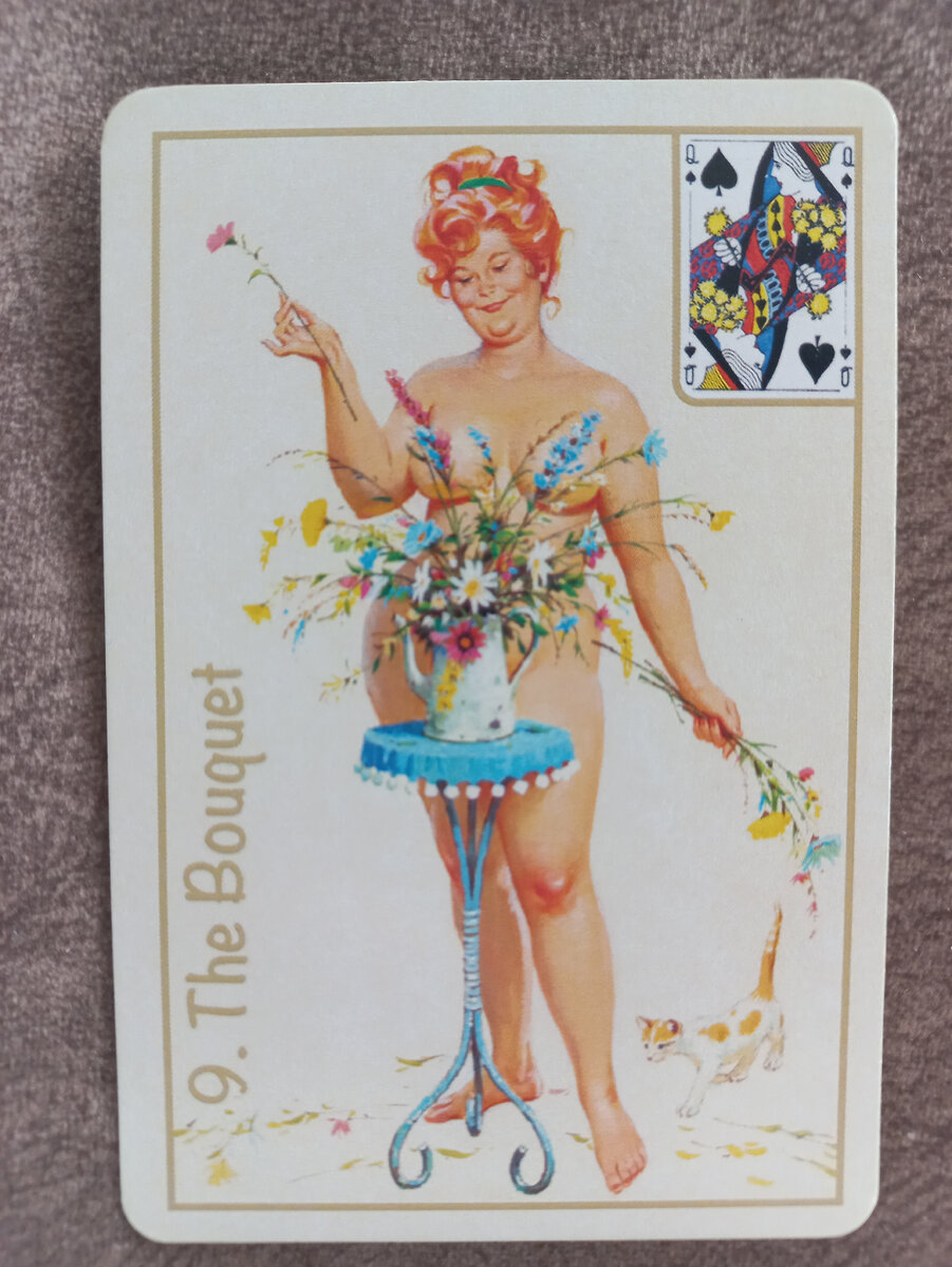 Букет Хорошая и красивая карта…изображена обнаженная дама, увлеченная процессом сборки букета…о чем говорит это изображение? Ну, во-первых, Ваша дама однозначно до конца недели будет увлечена каким-то делом, будет полностью погружена в какой-то процесс. Это банально могут быть рабочие дела (или садово-огородные), а также какой-то творческий процесс: ваша дама может быть увлечена созданием шедевра, воплощением в жизнь своей оригинальной (или не очень) идеи. Она может печь пироги и торты, вышивать крестиком, валять куколок из войлока, плести из соломки и вязать. Да все, что угодно может делать! Даже мыть окна после зимы! Но главное, что она будет сосредоточена на этом деле. Ей однозначно будет нравиться процесс, а еще больше - результат! Во-вторых, Ваша дама будет явно не сильно заморачиваться со своим внешним видом в эти дни: приготовьтесь увидеть Её максимально естественной и простой, без заморочек. Но тем не менее, следует отметить, что лично её саму такой «лук» (как сейчас модно гов