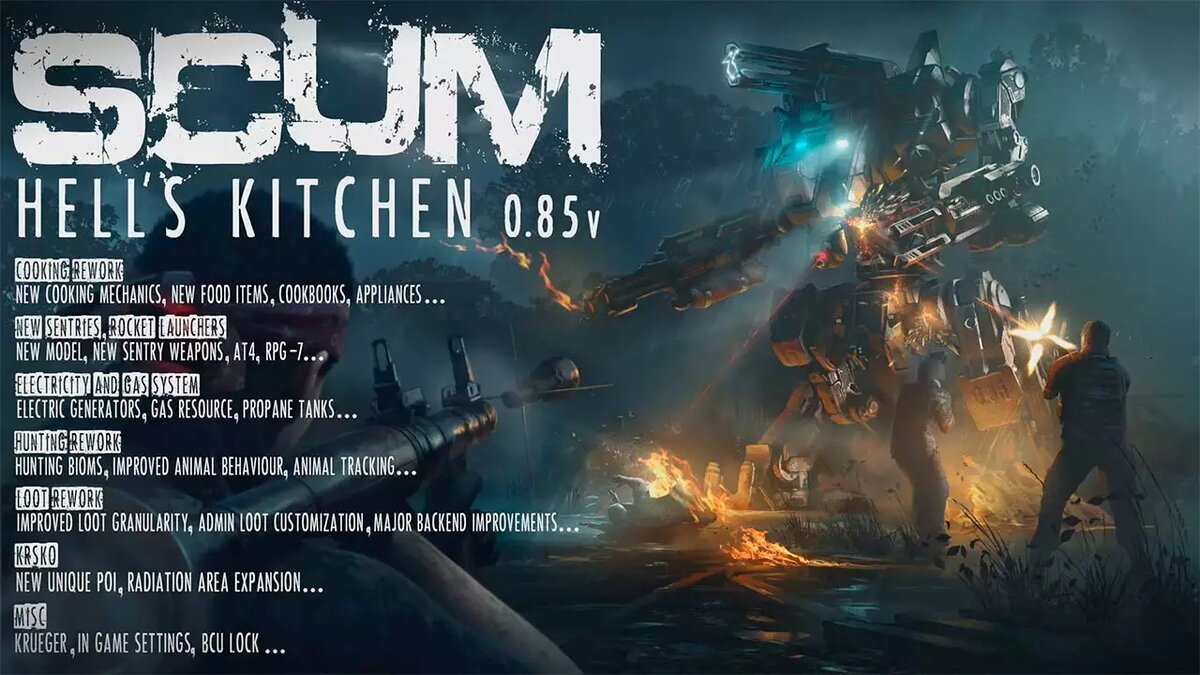 10 мая 2023 года разработчики SCUM опубликовали трейлер обновления "Адская кухня", в рамках предстоящего патча 0.85 ожидаются глобальные изменения кулинарии, новые роботы и оборудование, локации и лут. Авторы survival шутера обещают большую систему кулинарии с продуктами, рецептами и кухонной техникой. Введут абсолютно новые типы роботов, а игрокам дадут возможность использовать RPG-7. Реализуют систему электричества и газификации, включая электрогенераторы, баллоны с пропаном и прочее оборудование. Будет улучшена система охоты с новыми биомами и реалистичным поведением животных. Дополнительно можно ожидать новое вооружение, качественный интерфейс и мелкие исправления известных багов. Новость на сайте: https://topinator.ru/652-anons-obnovlenija-adskaja-kuhnja-085-dlja-scum.html