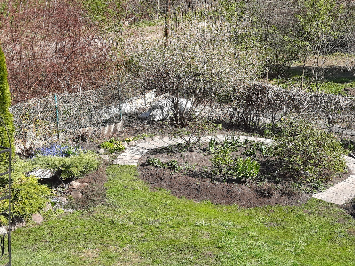 Привет всем заинтересованным и не очень! Посмеялась сегодня над собой. Шестой день, сил на тяжелые работы не хватило. Так что я сегодня опять "за лопатой ходила". Что-то выносила, что то сажала, что-то поливала, прибирала, перекладывала, мыла. Далее, по списку. Ходила по саду, рассматривала, что в какой состоянии на настоящий момент. Вот, увидела, что левый куст жимолости требует общения с секатором, а чабрец выглядит "не ах". За секатором идти было лень, оставила на потом, а вот к чабрецу наклонилась. Много сухого. Если обрезать сильно, можно и подушку потерять, не отойдет. Решила потискать. Оказалось, весьма продуктивно. Промассировала, протискала все кустики. Мелочь осталась внизу в качестве мульчи, вид стал получше, быстрее зазеленеют. И здесь потискала. А это я вам ручкой машу! Можжевельник горизонтальный попросил протрясти его как следует, чтобы осыпалась высошая хвоя. Посвежел вид после этого. Туечки получили сеанс массажа. Что-то осыпается, что то пока нет. Хотела опрыскать л