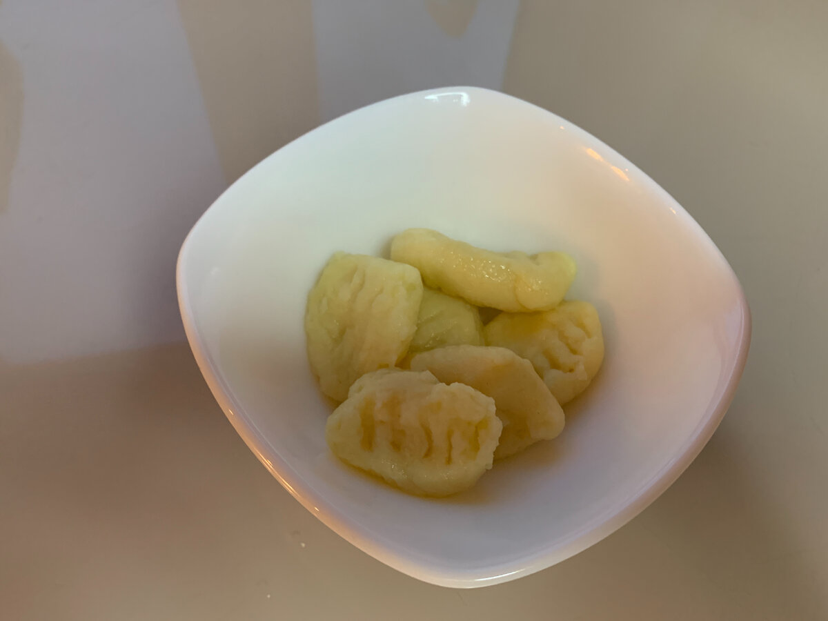Делюсь пошаговым рецептом, как я готовлю это блюдо Нам понадобится: Картофель - 500 гр (±7-8 средних картошек) Мука - 150 гр. Масло сливочное - 50 гр. Яйцо - 1 шт. Соль - щепотка Приготовление: Картофель отвариваем до готовности Добавляем сливочное масло и разминаем толкушкой Добавляем яйцо и опять разминаем Добавляем 100 грамма муки (на оставшихся 50 граммах будем раскатывать Ньокки) и перемешиваем. Получается тесто, которое свободно отходит от стенок кастрюли Присыпаем мукой доску и раскатываем в колбаску 1/4 часть теста. Разрезаем на кусочки толщиной ±2 см. Получается уже готовый Ньокк (или как его назвать один-то?) и приминаем его вилкой, чтобы получилась вот такая форма. Проделываем тоже самое и с другими Ньокками Отвариваем в подсоленной кипящей воде буквально 2 минуты. Как только Ньокки всплыли - вынимаем шумовкой. Идеально посып