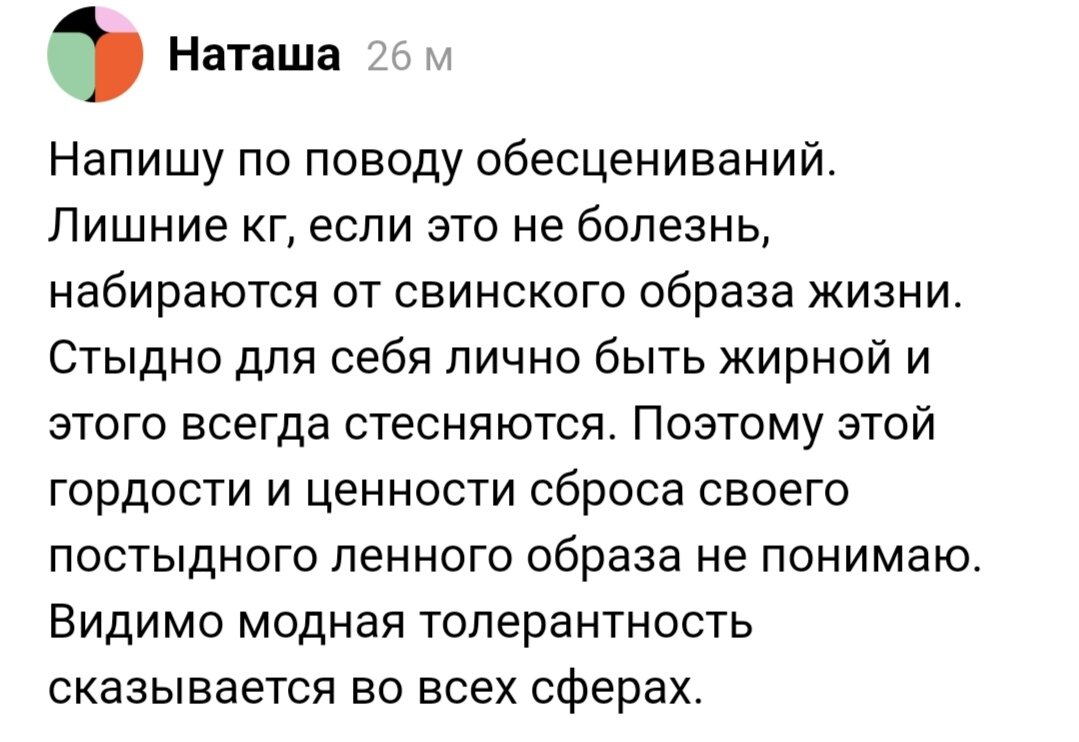 Здравствуйте, мои дорогие друзья и гости канала. Для тех, кто впервые заглянул на огонек, расскажу о себе: Меня зовут Светлана, мне 41 год и я похудела на 20 кг с марта 2022 года. Рост 165 см, начальный вес 90 кг. Сейчас вес 70кг. Цель - 65 кг. Худею по системе "Гибкая диета", чередую интуитивное питание и подсчёт КБЖУ. На своем канале я веду дневник похудения, а так же делюсь понравившимися рецептами ПП, рассказываю историю своей жизни. Друзья мои, всем доброе утро и хорошего приятного дня🌹💃🌸. На тему этой статьи меня натолкнул комментарий, которые был добавлен здесь👇 А именно к тому, что я не обесцениваю свой труд в похудении. Сначала я восприняла всё в негативном свете, ну это понятно, так как высказано всё в довольно грубой форме. Но потом я начала мыслить и анализировать и в итоге пришла к следуюшему. Каждый имеет право на свое мнение, я не могу согласиться с вышесказанным, но и категорически оспаривать не буду, просто напишу свое умозаключение по каждому пункту, а вам уж реш