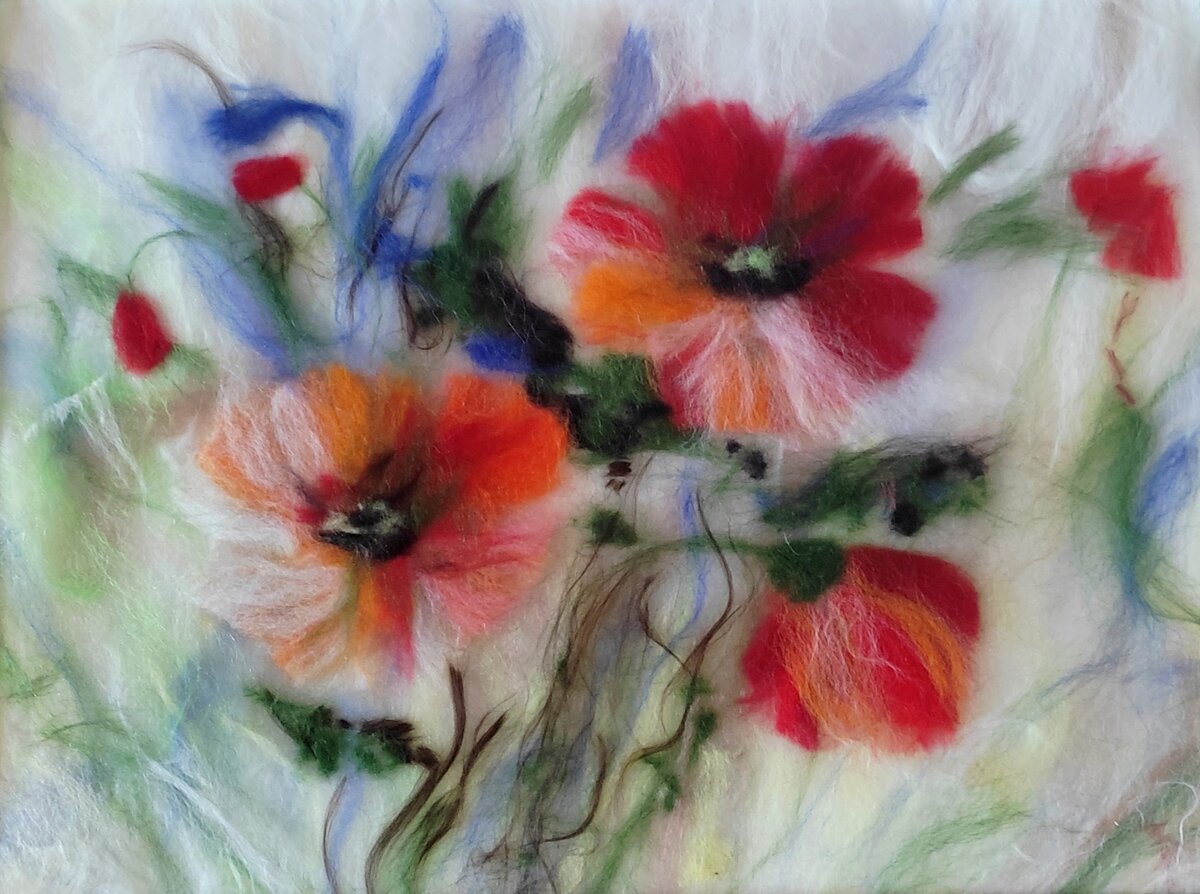 Подобно краскам, шерсть можно смешивать и получать новые цвета. Для получения зеленого набирают одинаковое количество синего и желтого волокна, затем много раз складывают и вытягивают поочередно, пока оттенок не станет однородным. Смешивание цветов позволяет получить необычайно красивые градиенты. Для создания картин из шерсти используют такие приемы: Вытягивание. Из общей ленты вытягивают прядки разной толщины и плотности (по усмотрению художника). Процесс называется «метод вытягивания» и дает как бы мазки акварелью. Выщипывание. Способ интенсивного выщипывания прядей со сгиба ленты, которые образуют воздушный комок (или шерстяную вату) подобно кардочесу. Выщипывание очень тонких прядей подходит для изображения теней, облаков, тумана, дымки. Обрывание. Более мелкие мазки получают путем отрыва от общей массы маленьких кусочков с рваным краем. Скручивание. Формируют кручением тонкую нить, одновременно вытягивая прядь из ленты и вращая. Подходит для изображения линий, стеблей, травинок,