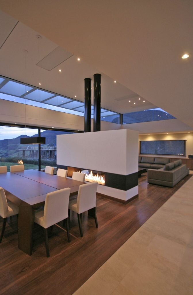 Несмотря на минималистский дизайн и отсутствие каминной полки, этот камин по-прежнему занимает центральное место. В этой части пространства доминируют высокая частичная стена и длинный камин с пристройками.