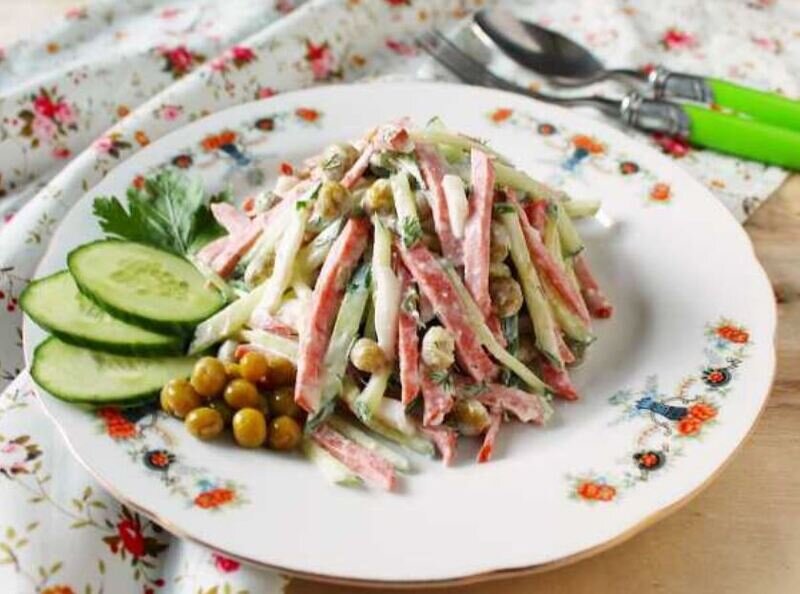 Обязательно попробуйте и приготовьте вкусный салат с колбасой горошком и свежим огурцом из разряда — просто и сытно. Салат получается сочным, сытным, свежим и нежным. Из таких нехитрых продуктов вполне можно приготовить замечательный салатик. Заправить салат можно майонезом, сметаной или другим любимым соусом. Делюсь понравившимся рецептом. https://luchshierecepty.ru/salat-s-kolbasoy-goroshkom-i-svezhim-ogurtsom.html