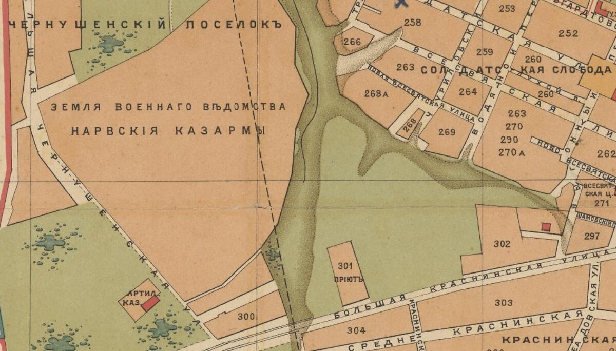 До революции на этом месте, являвшемся тогда городской окраиной, был расквартирован 3-й пехотный Нарвский полк генерала-фельдмаршала князя Михаила Голицына. Возник этот полк ещё в 1703 году, а своё название он получил пять лет спустя, после штурма города Нарвы. Полк принимал участие во многих войнах. За отличие в сражении при Лаоне в 1814-м его личный состав получил особые знаки на шапки, а за русско-турецкую войну 1877-1878 годов – Георгиевское полковое знамя. В год столетнего юбилея Отечественной войны 1812 года на крепостной стене появилась мемориальная доска в честь участия Нарвского полка в Смоленском сражении. Но спустя шесть лет полк был распущен, причиной чему стала революция. За Чуриловским оврагом находились казармы воинской части, также на рубеже XIX-XX веков было построено несколько кирпичных зданий для офицеров и их семей. До наших дней сохранилось несколько двухэтажных зданий и офицерское собрание. Все они являются памятниками архитектуры, и в некоторых из них до сих пор