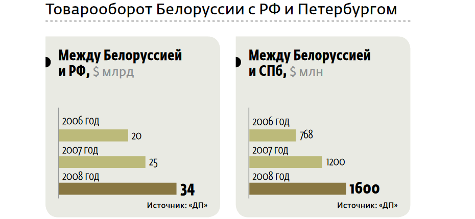 - Товарооборот между Белоруссией и Петербургом в 2008 году составлял $1,6 млрд. Для сравнения, в 2022 году действующий губернатор города Александр Беглов заявлял, что товарооборот с Белоруссией по итогам 2022-го достиг $2,6 млрд