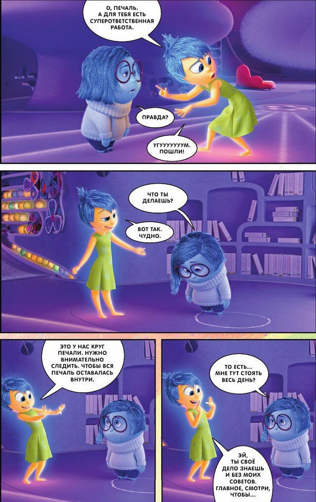 На самом деле периодически автор подбрасывает нам правильный ответ. К примеру, воображаемый друг Райли, заброшенный ее воспоминаниями, испытывает горе и в этот момент печаль решает поговорить с ним. Не смотря на скепсис со стороны Радости, хоть Печаль и нагнетает обстановку, но это помогло отпустить ситуацию и выплеснуться.