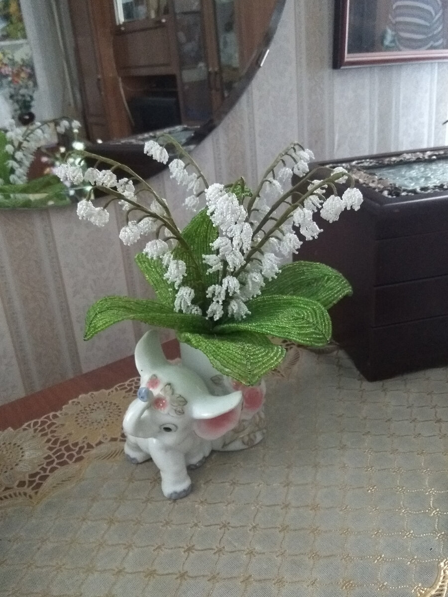 Два года назад я увидела в интернете мои любимые цветы - ландыши, сплетенные из проволоки и бисера. С этого началось мое новое увлечение - бисерная флористика. В то время у меня совсем не было опыта, я не знала где покупают проволоку, бисер и другие материалы, необходимые для бисероплетения. Но желание у меня было огромное и как всегда, если что-то задумала надо сразу же начать действовать. В городе я знала только один магазин, в котором продаются материалы для творчества -это Леонардо. Я еще тогда не знала, что он просто фантастически дорогой. Но желаемое надо превращать в действительное. Я купила японский бисер (он самый дорогой) потому, что мне нужен был калиброванный самый мелкий бисер на цветочки. Плела я букетик где- то месяц. Я еще тогда не знала приемов плетения, не могла рассчитать нужное количество бисера и проволоки, но букетик получился.