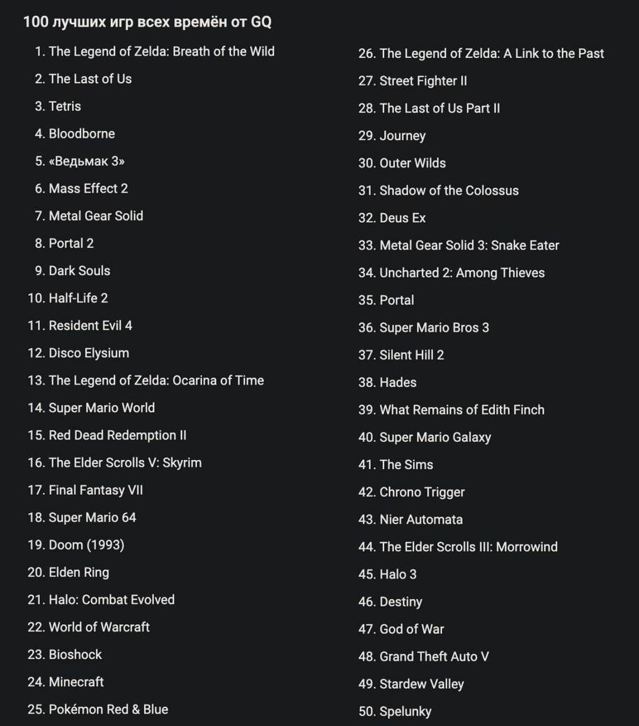 Издание GQ опубликовало рейтинг из 100 лучших видеоигр в истории. Топ составлялся на основе опроса критиков, журналистов, разработчиков и контент-мейкеров. На первом месте оказалась The Legend of Zelda: Breath of the Wild. Релиз игры состоялся в 2017 году на платформах Nintendo Switch и Wii U. Тайтл в жанре action-adventure продолжил историю легендарного героя Линка. На втором месте оказалась The Last of Us. Игра была выпущена в 2013 году эксклюзивно для консоли PlayStation 3, после появилась на PS4 в качестве ремастера. Тайтл про необычный зомби-апокалипсис был принят тепло комьюнити и критиками. Тройку же лидеров замкнула головоломка Тетрис (Tetris). Отметим, что после 50 места в списке GQ можно увидеть культовый Fallout New Vegas, популярный Undertale, Civilization V, а также GTA 3 и The Sims 2. На последнем же месте оказалась Star Wars: Knights of the Old Republic, игра вышла в 2003 году. Успейте принять участие в нашем конкурсе прогнозов на BLAST.tv Paris Major 2023! Призовой фонд