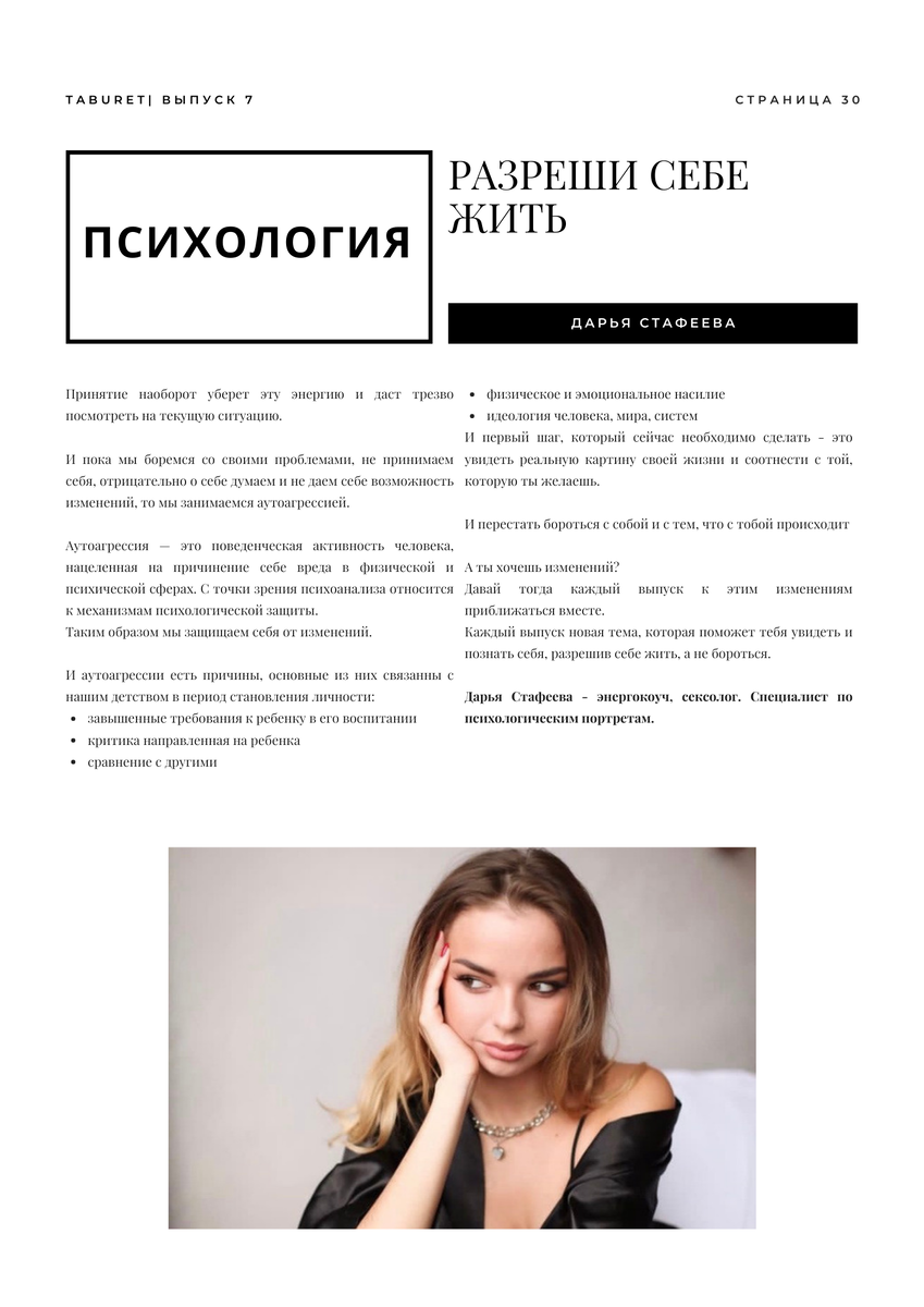 В 7 выпуске TABURET опубликована первая статья от Дарья Стафеева в цикле "Разреши себе жить", где она рассказывает о борьбе с собой, принятии и выборе своей жизни.