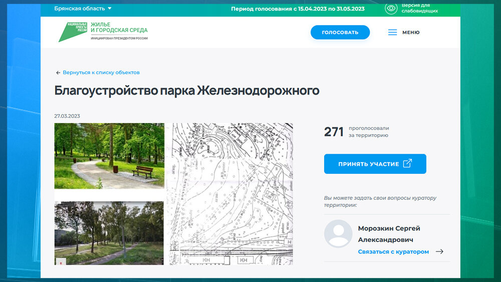Продолжается рейтинговое голосование за объекты благоустройства в Брянской области. На этот раз речь пойдёт про Дятьково. Там среди объектов, выдвинутых на голосование, есть парк Железнодорожный (ссылка на страницу проекта). На момент написания новости за объект проголосовал всего лишь 271 человек. Лидер по Дятьково – городской парк. На момент публикации новости свои голоса за него отдало 2405 человек. Голосование за объекты благоустройства проводится по национальному проекту «Жильё и городская среда». На момент публикации новости свои голоса отдало более 51 тысячи человек. Жители Брянска не получат нормальный парк возле ДК БФЗ. В Дятьково за проект обновленного парка Железнодорожного проголосовало 267 жителей