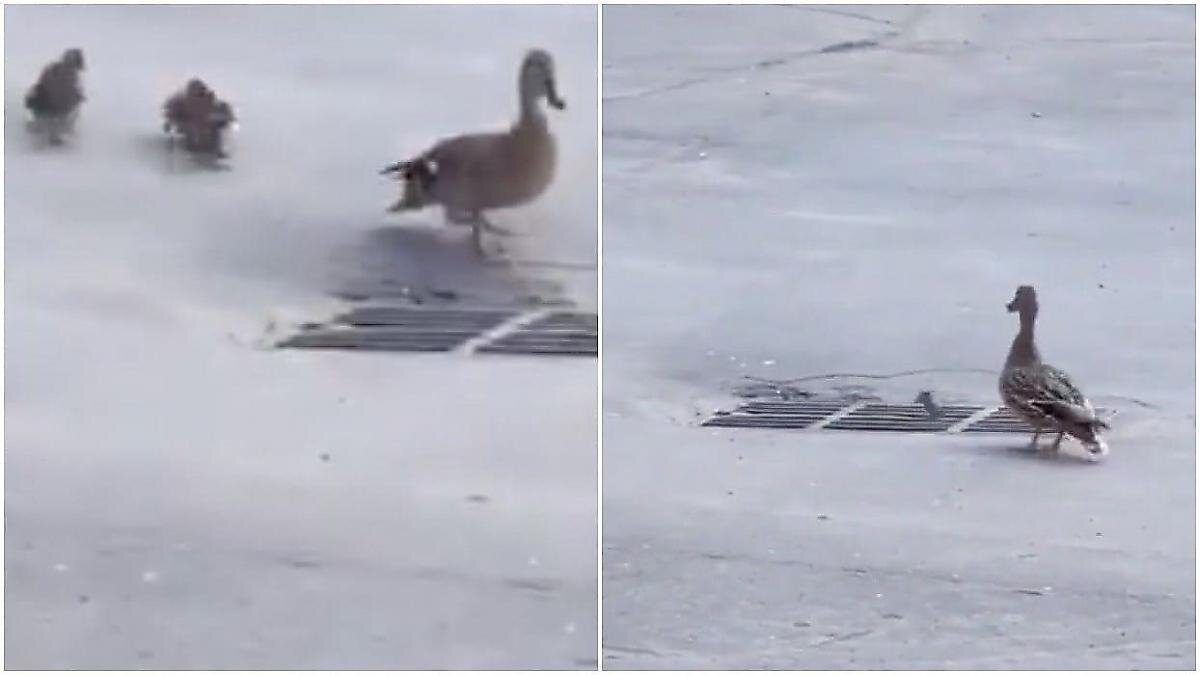 Драматичный момент пересечения дороги утиным выводком, был запечатлён случайным очевидцем предположительно в Москве. Глава утиного семейства, прокладывающая маршрут мимо решёток водослива, потеряла одного детёныша. Пернатая мамаша допустила ошибку, когда решила вернуться к опасному месту, чтобы помочь птенцу и в итоге всё её многочисленное потомство последовало за первым утёнком и провалилось сквозь решётку. Ранее в сети появилось видео со спасательной операцией, когда неравнодушный пешеход спустился вниз и один за другим достал птенцов, оказавшихся в водосливе. Хотелось бы верить, что этот видеоролик является продолжением предыдущего сюжета. Ранее участник дорожного движения сделал остановку, чтобы запечатлеть неравное противостояние пернатых обитателей австралийского Мельбурна. Автовладелец, предвкушая расправу, не покидая салон легковушки, до последнего момента снимал птичье противостояние, чтобы, с его слов, выложить ролик в Facebook. Но появление работника дорожной организации