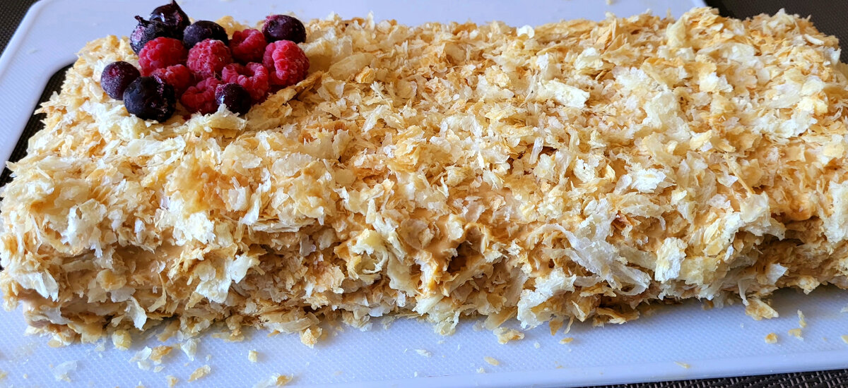 Когда нет времени на торт можно воспользоваться этим рецептом Это вариант тортика достаточно очень простой в приготовлении и понадобиться всего 3 ингредиента Для приготовления нам нужно: Тесто слоёное 400 гр (2 пластинки) Сметана 300 гр. ( у меня 20%) 1 банка варёной сгущёнки Раскатываем тесто,но не очень тонко Разрезаем на 2 половинки одинаковых.С другой пластинкой делаем тоже самое,раскатываем и разделяем на 2 половинки,в итоге у нас должно 4 шт. получится Отправляем в духовку на 20 минут при 180 градусов Пока тесто в духовке,занимаемся кремом берём сметану и сгущёнку и взбиваем блендером Всё готово можно собирать тортик Каждую пластинку разрезаем пополам,по краям обрезаем неровности (их не выбрасываем это пойдёт на крошку для украшения тортика) Каждый слой промазываем кремом По бокам промазываем кремом и выравниваем лопаточкой Измельченной крошкой посыпаем сверху и по бокам. Отправляем в холодильник на 30 минут Вот такая вкуснятина получилась Так же у меня есть похожие рецепты из с