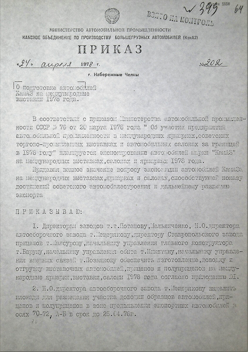 Как известно, КАМАЗ начал участвовать в международных выставках с 1977 года. Сегодня предлагаю вам познакомиться с двумя документами. Внизу приказ генерального директора КАМАЗа от 24 апреля 1978 года «О подготовке автомобилей КАМАЗ на международные выставки 1978 года». Посмотрите, какие автомобили и в какие страны планировалось их отправить 45 лет назад. Но, выше размещённый приказ генерального директора КАМАЗа не был полностью выполнен. Был допущен срыв поставок автомобилей в Болгарию, Германскую Демократическую республику и Чехословакию. Посмотрите, какие замечания понесли за это Барун Владимир Наумович – главный конструктор КАМАЗа и Позняков Сергей Николаевич – начальник управления внешних связей КАМАЗа. 27 января 1979 года генеральный директор КАМАЗа подписал приказ №39 «О подготовке автомобилей на зарубежные выставки». Посмотрите, как расширилась география выставок в 1979 году! Документов о невыполнении вышеуказанного приказа в фондах музея КАМАЗа не обнаружено.