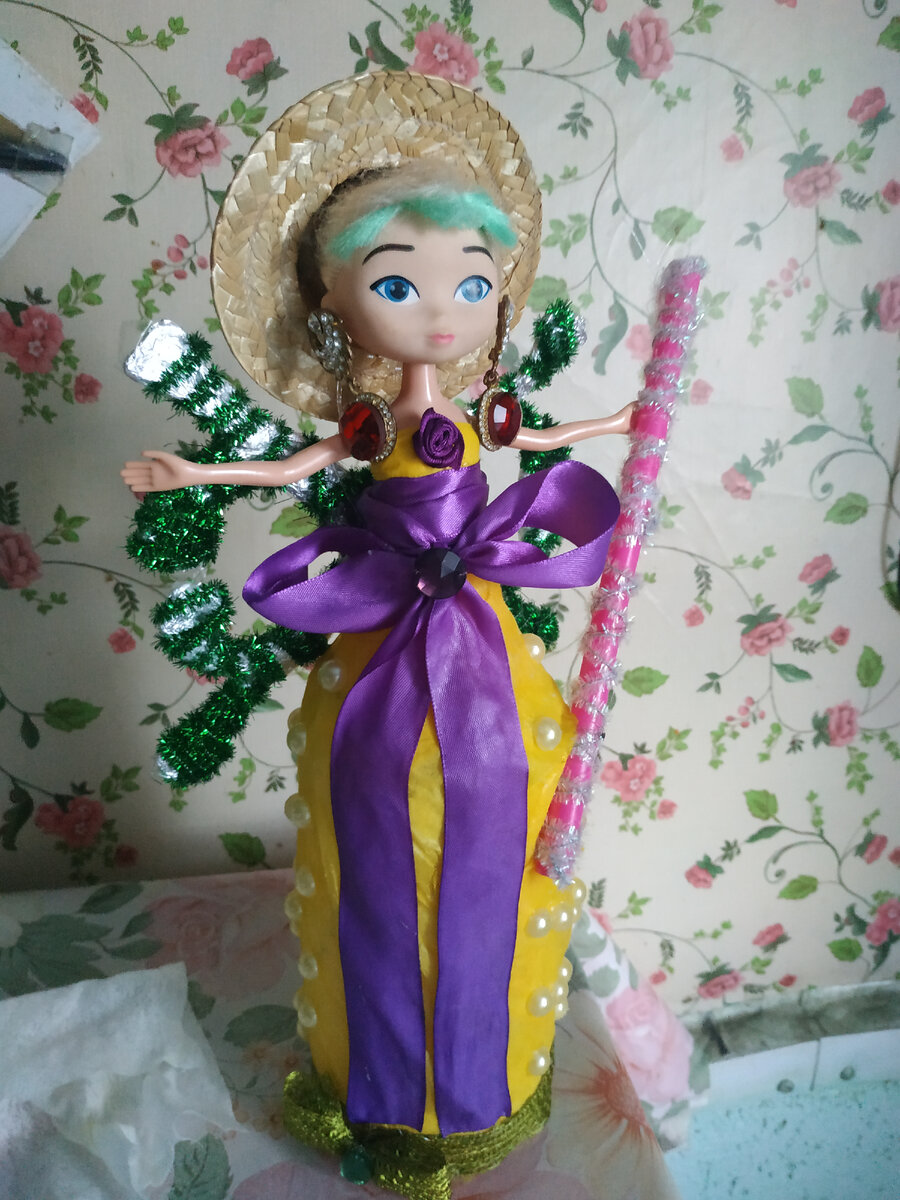 Эта куколка изготовлена ,не полная часть от куклы барби ,юбочка сделана из. Бутылочки от шампуня, платье сделано из цветочного оберточного материала, поясок, сделан из цветочной ленточкой .цветочек розочка для декора ,Низ платья тоже цветовая ленточка. На ней. Приклеена зелёная стразинка. Юбочка обклеена желтенькими полубусинками . И обклеино цветовыми паетками. Шляпка не а куколке. Соломенная. В ушах. Клипсы серьги .крылышки вырезанные из картона и обклеены фольгой и обмотаны мишурой на проволоке.в руках у куклы волшебная палочка она от фломастерного футляра . И также. Обмотана. Мишурой на проволочке белого цвета .