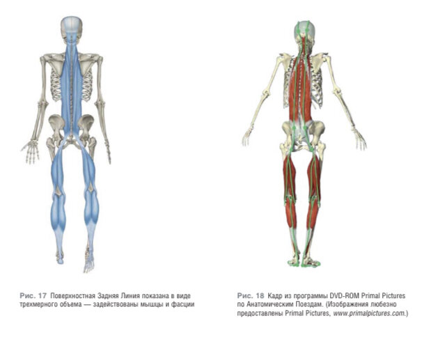 Здесь будет рассмотрена задняя миофасциальная линия. Задача этой фасции держать тело ровно и не давать ему сгибаться, что собственно и происходит при длительном нахождении в положении сидя. Фасция как оболочка соединяющая определенные группы мышц в цепи, эта цель учавствует в выпрямлении и переразгибании, собственно такие упражнения и помогут задать необходимый стимул для ее работы, и после эта линия будет работать лучше и будет выносливее, а это уже профилактика многих недугов. Выглядит эта фасция таким образом. Она идет от основания черепа, вдоль всего позвоночного столба, через бедра к икрам и стопам. И нам пригодятся упражнения на удержание определенного положения в планке, упражнения на разгибатели спины, махи ногами из положения лежа. В общем нам нужно создать эффект растягивания, напряжения с определенным временем под такой нагрузкой. Эта тренировка направлена на медленные мышечные волокна, отвечающие за выносливость. Вот несколько из упражнений: Махи ногами из позиции лежа. 30с