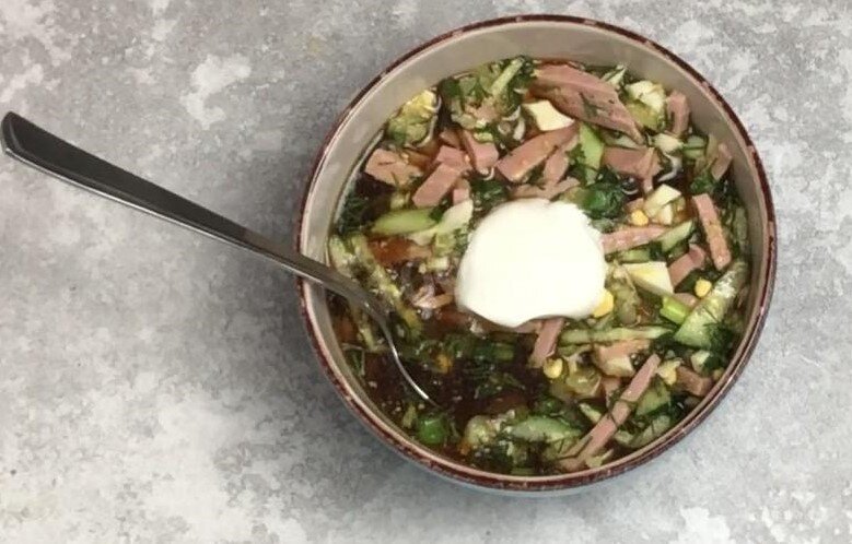 Окрошку порционно выложить в тарелки и залить квасом. Посолить по вкусу и добавить сметану. Приятного аппетита!
