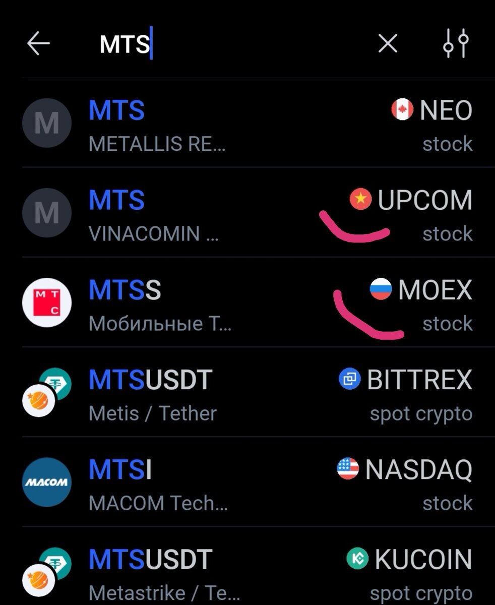 Вот, например, легко можно перепутать на платформе Traiding view тикер MTS, тикер компании, торгующейся на американской бирже и MTSS – наши российские мобильные телесистемы. И только шарик с российским флагом развеивает сомнения)). Еще можно сравнить ISIN –коды, 12-ти разрядный код из цифр и букв со сквозной классификацией для акций каждого государства в отдельности, где первые две буквы обозначают принадлежность к соответствующему государству. В общем, не будете вы сравнивать ISIN-коды акций. 😁Главное, знать, что они есть! 👌