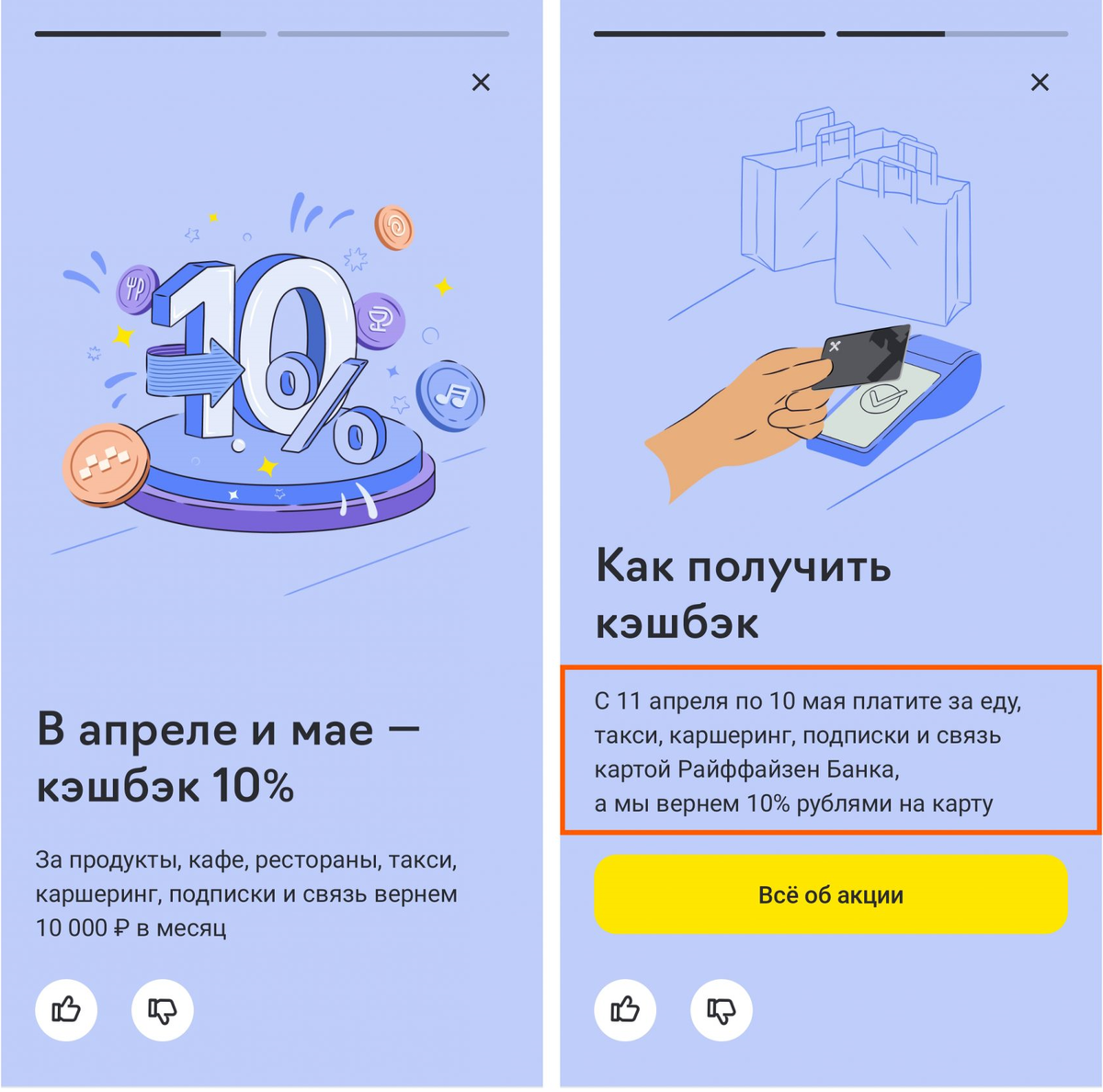 Всем привет! Иногда, листая Дзен, вижу в статьях других блогеров про интересные предложения банков (как обычно, именно этих карт данных банков у меня нет) - что есть очень хорошие предложения по кешбеку - аж в 10% Я достаточно давно пользуюсь Тинькофф. Да, карта (да и сам банк) в последнее время не самый выгодный по предложениям - если сравнивать с конкурентами - но для нас выгоднее и привычнее именно он. Конечно, есть на руках и карты других банков: Альфа, Втб, Сбер, Юмани, Райффайзен и Россельхоз. На двоих как-то получилось многовато) Но ими почти не пользуемся и в мобильные приложения заходим редко, лишь по необходимости А тут 22 апреля я зашла в мобильное приложение Райффайзенбанка (как обычно, я в поиске выгодных накопительных счетов) и увидела вот это: Первая моя мысль была: "Почему я увидела это классное предложение так поздно?" Но лучше поздно, чем после завершения акции Как потом оказалось, в апреле кешбек на обычные покупки вместо 1,5% был аж 3% - приятно) С 22 апреля все