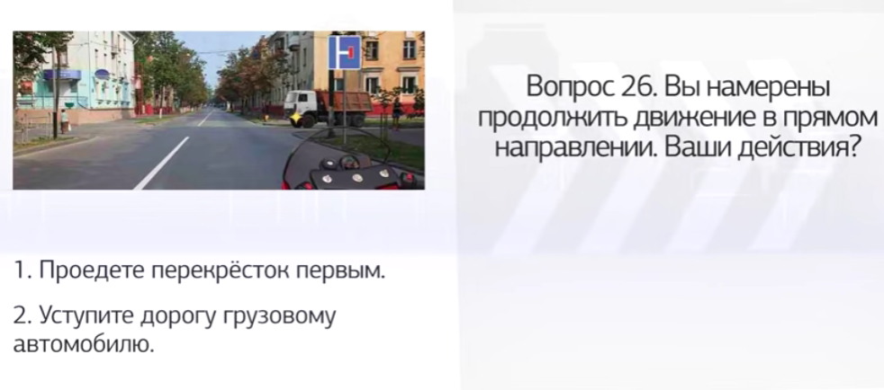 Вопрос номер 26. Вы намерены продолжить движение в прямом направлении. Ваши действия. Смотрим на предлагаемый нам перекресток. Светофора нет. Регулировщика нет. Знаков приоритета тоже нет. Вывод. Перед нами перекресток равнозначных дорог, на котором мы должны уступить дорогу грузовому автомобилю согласно правилу помехи справа. Знак «тупик», который здесь установлен и многих вводит в заблуждение, не является знаком приоритета, а значит, не определяет порядок разъезда на этом перекрестке. Он лишь информирует водителя о том, что дорога справа не имеет сквозного проезда. Правильный ответ номер 2. Уступаем грузовому автомобилю. Вопрос номер 27. Кому вы обязаны уступить дорогу при повороте налево? В представленном вопросе ситуация показана на перекрестке, где знаки приоритета есть. При этом мы движемся по главной дороге. Табличка под знаком информирует нас о том, что главная дорога меняет свое направление, уходит налево. Второстепенная дорога таким образом примыкает справа. Мы находимся на