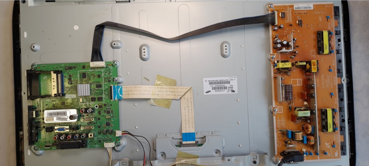 Всем здравствуйте! Сегодня у нас на ремонте телевизор Samsung le32b450c4w с диагнозом говорит но не показывает. По факту при включении на пару-тройку секунд появляется изображение и гаснет. Итак будем пробовать решить проблему. Смотрим на то что у него внутри. По традиции майн bn41-01165b Блок питания bn44-00260C t-con под радиатором, туда не полез. Для начала замерил напряжения питания , они соответствуют заявленным. 5, 13 вольт есть. На сетевой банке 390 вольт Я в предвкушении лёгкой добычи начинаю осматривать пайки. Кольцевые трещины это типовуха для таких блоков. Но вот нашёл пару подозрительных мест у транзисторов. Пропаял, включаю и ...без изменений. Решил сделать следующее. Наверное поспешил, но с другой стороны проверить надо. Драйвер подсветки собран на микросхеме bd9893f и я решил снять защиту. Поставил резистор 10 кОм к 10-му выводу и на минус. Включил , подсветка запустилась, стал показывать но верхняя часть матрицы немного затемнена. (фото забыл сделать) И буквально з