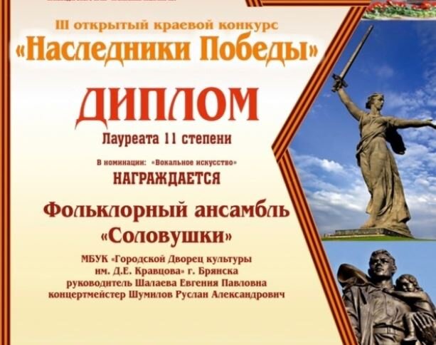 Брянский фольклорный ансамбль «Соловушки» стал лауреатом второй степени в III открытом краевом конкурсе «Наследники Победы». Он проходил в Краснодарском крае. За побуду боролись представители многих регионов России: ДНР, ХМАО-Югра; края: Забайкальский, Ставропольский, Красноярский, Краснодарский, Камчатский, Хабаровский; области: Кемеровская, Оренбургская, Брянская, Владимирская, Белгородская, Воронежская, Новосибирская, Липецкая, Иркутская, Саратовская, Смоленская, Московская, Ивановская, Сахалинская. Об этом сообщили в ГДК имени Кравцова. Основные задачи конкурса — сохранение и популяризация музыкального, поэтического и художественного наследия. Он посвящен победе советского народа в Великой Отечественной войне 1941-1945 годов. Брянский фольклорный ансамбль «Соловушки» победил в конкурсе «Наследники Победы»