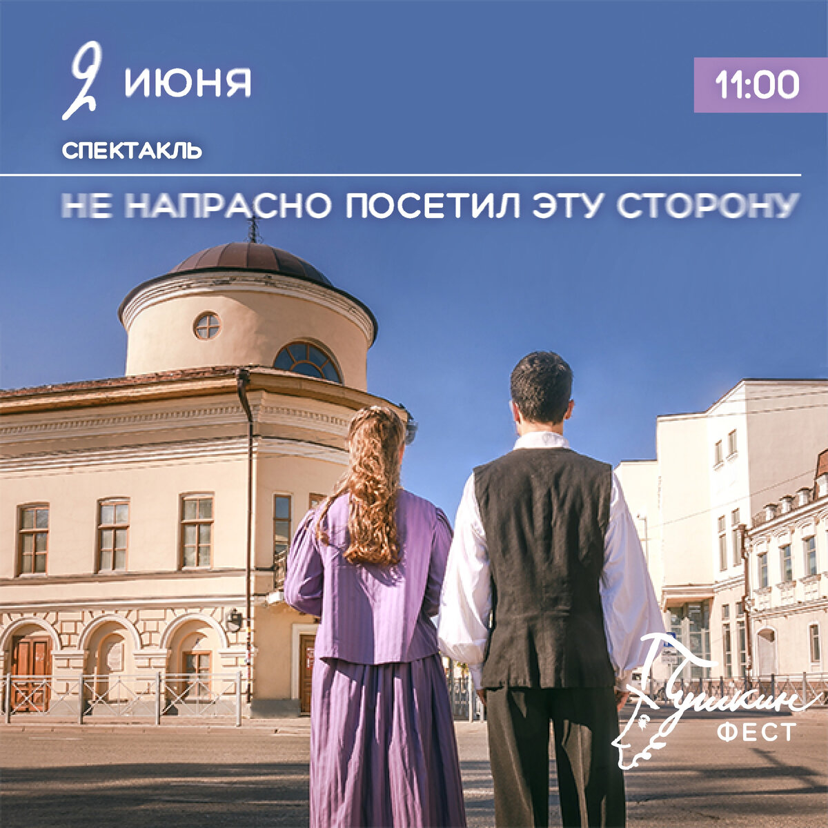 2 июня в 11:00 приглашаем на премьеру Культурного центра имени А.С. Пушкина – спектакль-фантазию «Не напрасно посетил эту сторону», посвящённый 190-летию пребывания А.С. Пушкина в Казани в 1833 году. Вместе с главным героем – конечно же, Александром Пушкиным – зрители побывают в местах, которые посещал в Казани сам поэт и познакомятся с известными горожанами, что жили здесь в этот период. Исторические факты, интересные персонажи позволят зрителям глубже окунуться в историю нашего края, познакомиться с казанским отрезком пути в большом путешествии А.С. Пушкина по Пугачевским местам Поволжья и Оренбургской губернии, связанным с работой над «Историей Пугачева» и романом «Капитанская дочка». Режиссёр: Ирина Соколова. Роли исполняют участники Молодёжной театральной студии «ГЛАГОЛЬ» и артисты Культурного центра имени А.С. Пушкина. 📍Культурный центр имени А.С. Пушкина, ул. К.Маркса, 26 ✔Вход по бесплатной регистрации, 6+