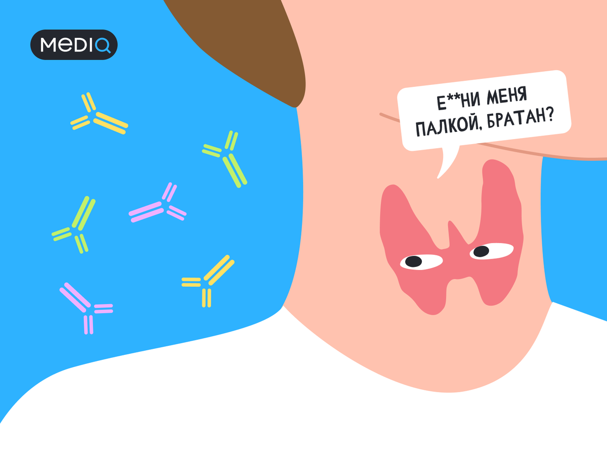 Ещё немного про щитовидку — точнее, про связанные с ней анализы, которые не надо лечить. И которые не надо сдавать самостоятельно. Антитело — это такой белок, который связывает конкретную молекулу (или часть молекулы); чаще всего это нужно организму для обезвреживания микробов: антитела работают «наводчиками» для иммунных клеток. Иногда возникает friendly fire, и антитела образуются к собственным тканям организма; при этом уровень проблемности может быть от незаметного нарушения функции до аутоиммунного повреждения органа. Иммунная система может щемить разные ткани и органы, а сегодня мы поговорим про атаку на щитовидную железу: «неправильные» дерзкие антитела могут вырабатываться к тиреоидной пероксидазе (ТПО — фермент, работающий в щитовидке), тиреоглобулину (ТГ — промежуточный продукт деятельности щитовидки) и рецептору тиреотропного гормона (рТТГ — гормон выделяется в головном мозге, в гипофизе и через этот рецептор подстёгивает работу щитовидки). Пероксидаза и глобулин Главная фун