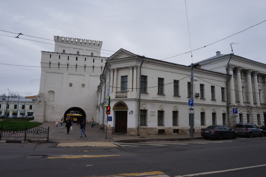 Вон оттуда мы сюда пришли. Здесь любопытно то, что к Знаменской башне был пристроен в 19 веке храм «Знамение». С таким архитектурным решением мне прежде не приходилось сталкиваться. Получается, что пешеход проходит под церковью и под ней же играют уличные музыканты.